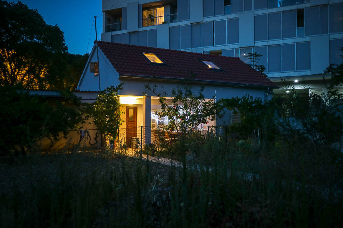 Prizemnica sa vrtom među poznatim spinutskim neboderima nadograđena je potkrovljem. Obiteljski život u kući oplemenjen je svijetlom koje prodire kroz krovne prozore, prožimanjem prostorija bez pregrada te toplinom drva u interijeru.